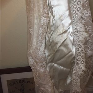 Ahhh my wedding dress: I love it but don't need it any longer! Gorgeous silk wedding dress with floral lace overlay. Tried to post as many photos are possible. Beautiful button detail, has alterations for bustle and built in cups for full B/C cups. Size 8 with alterations. I'm 5"7 120 lbs and wore a small heel. Spent over 1,000 on the dress plus alterations. Needs to be dry cleaned; I priced that in mind. Other than that in beautiful shape. Just slightly off from true white