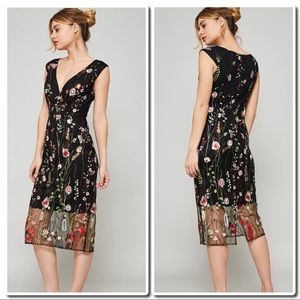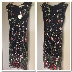 Measurements laying flat - pit to pit and seam to seam . Description: Fitted, sleeveless, embroidered plunging neck midi dress. Featuring embroidered sheer layer, skirt under layer, concealed zipper at back. This dress is made with a medium weight embroidered fabric that has a very beautiful embroidered flower patterns.