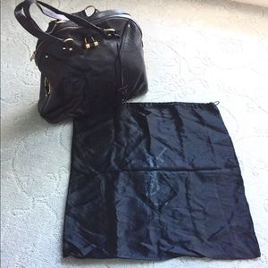 Muse tote in smooth dark brown textured leather, features gold tone brass hardware, oversized Y panels with top stitching, gold tone brass lock, hanging clochette for keys with Y detail, large gold hoop sides, double top handles, double-zip closure. Made in Italy. Purchased at Neiman Marcus at Galleria Houston for $2,300 in Fall 2006.