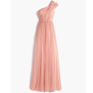 Grecian inspired, it features draped pleating across the fitted bodice that swoops up to a single shoulder front (interior boning for added support), & is finished off w. a beautiful long flowing silk chiffon skirt.