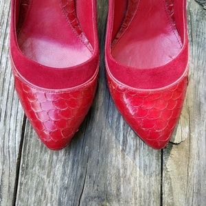 Beautiful python and suede leather heels in a stunning red color! I'm gorgeous condition with wear on the bottom sole. Heel caps are in very good shape with little wear. These do run a little small. I wore these with an insole as a size 8.5 M and they ran a little large so probably best for a 9 or 9.5