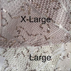 Brand new without tags. Size XL in juniors- so like a L in women's sizing. The color is hard to peg, but I would say it's more of a dark blush/pink color. I also do have this dress in size L in a lighter beige pink blush (shown in the last photo). This dress is 100% polyester, has center v-wire support, an elastic waistline and is a showstopper for sure! In the cover shot and in the 6th picture I am showing it modeled in a white color - I just wanted to give you an idea of what it looks like on!