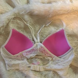 Victoria's Secret PINK white lace racerback bra size small. Clasp in the back and adjustable straps. Worn a few times. Has some slight discoloration on the inside of the straps but no other stains or defects. Cups have underwire and are in great condition.