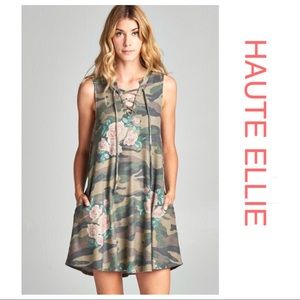 Lace Up Pocket Floral Camo Print Tunic/Dress. Made in the USA 🇺🇸. 85% polyester, 10% rayon, 5% spandex.