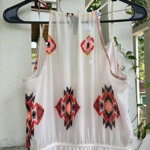 ✨♦️✨Stunning boho chic flouncy swing dress with an eye-catching southwestern-style pattern. This is the kind of dress that makes you want to spin in circles to watch it float around you! Lightweight, sheer and silky fabric, but not see-through (there is a lining under the skirt). A bit of elastic at the waist makes the shape very forgiving. ♦️NOTE: Fits slightly large (more like a small), and is very flattering!