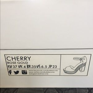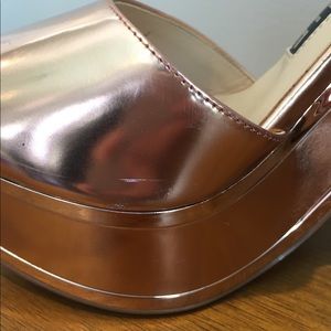 Rose gold patent leather platform by Nasty Gal x Kat Maconie features a chunky heel, peep toe, adjustable ankle strap and pearl detailing on outer side.