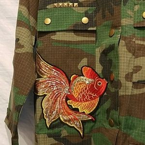 Fair Child camo jacket with patches. Stud details on the collar and pockets. Sequined fish patches on the front and on the back. Jacket is about 25 inches long from shoulder down. There are two big functional pockets at the top front and two decorative pockets at the bottom. 51% rayon, 49% polyester.