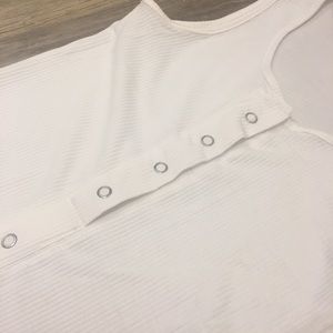 Ribbed knit tank dress featuring a snap-button placket (4 first snaps open and close), scoop neckline, and a form-fitting silhouette.