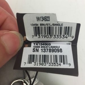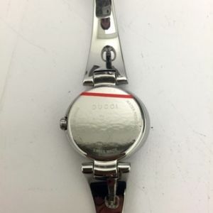 New with tags authentic Gucci Ladies "Guccissima" Stainless Steel Watch. Stainless steel bangle bracelet with round stainless steel case, 27 mm, G-shaped bezel. Brown sunray dial with silver-tone square hour markers, two hands and logo. Swiss quartz movement. Scratch resistant sapphire crystal. Pull/push crown. Solid case back. Jewelry clasp. Model number YA134503. Comes with original box and accompanying papers. Received as a gift, but never worn.