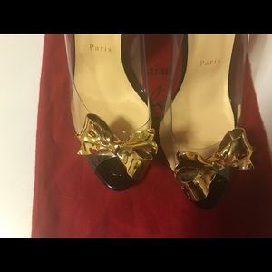 Clear PVC Christian Louboutin peep-toe Justinodo pumps with black patent leather trim, gold-tone metal bow at vamps and covered heels. Sold out everywhere, I purchased them from this site. They're 100% Authentic and was verified by a Poshmark concierge! Unfortunately they are too small for me! Heel measures approximately 100mm/ 4 inches. Slip on Small to size. Good fit for 10-10.5 worn once, mint condition! Flexible on price, just make an offer ! Comes with dust bag.