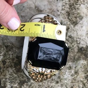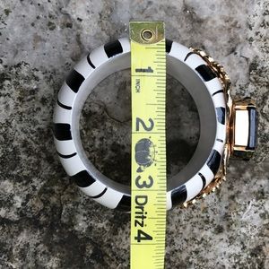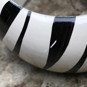 Zebra-stripes add a sassy vibe to this hand-painted wooden bracelet adorned with an dramatic onyx-style jewel on top. Gold-toned filigree accents the stone. Scratch shown in 6th picture. Overall good condition. Statement accessory! ✨Final Reduction✨
