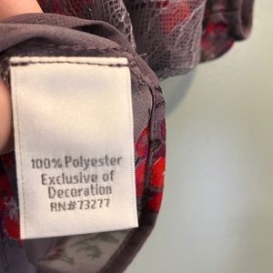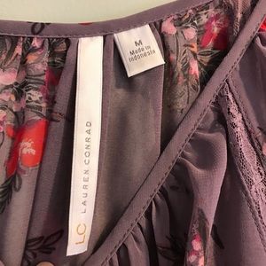 Beautiful sheer to, muted purple/lavender with floral design. Has buttons down the front, lace detail in the side. Looks beautiful with a tank top or camisole underneath. Perfect conduction, like new. Loose butterfly fit