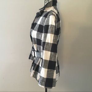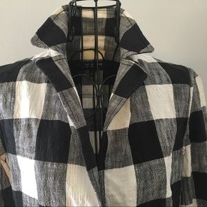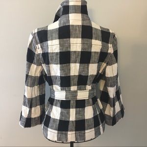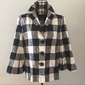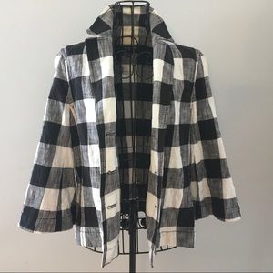WAS $50. Sophisticated and stylish black and white plaid crop jacket with 3/4 length wide sleeves and three large button closure by Jones New York. Handle your business and show off your style while wearing this jacket. Belt included. Nice quality material. Cotton/Nylon blend. Excellent condition. Make an offer today!