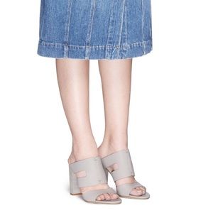 In excellent condition! Wear on bottom soles and tiniest scuff on left front strap. Diane von Furstenberg Cosenza Black Leather Mules. Striking cutouts highlight the bold vamp strap of a standout sandal. Leather upper, lining and sole. Heel height 4.25". Made in Italy. Comes with original box. Size 9. Last photo shows the shoes in gray. No modeling/trades.