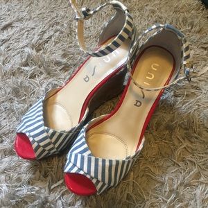 These peep-Toe wedge heals are so cute with a retro vintage look! Perfect for a cruise or island wear! Buckle ankle strap closure, cork wedge heal. The pop of red is perfect with red lips and a red belt! Great condition, only worn a few times, basically new!