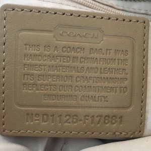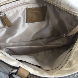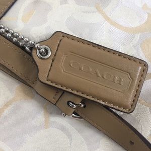 Authentic Coach bag with the C logo stitched in around it. It's a beautiful range of cream, tan, and brown colors with a satin like inside. Perfect everyday bag that goes with just about any outfit!