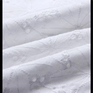 Bell sleeve eyelet lace cotton top. Elastic at shoulders with ribbon and tassel. Runs a little small. Price firm unless bundled. Small: Bust - 32, Length - 20.5, Sleeve - 20; Medium: Bust - 34, Length - 21, Sleeve - 20.5; Large: Bust - 36, Length - 21.5, Sleeve - 20.5; X-Large: Bust - 38, Length - 22, Sleeve - 22. Please use measurements when ordering. Runs a little small in the arms.