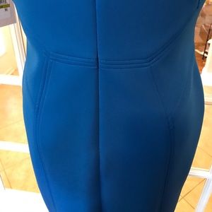 5🌟‼️- Lovely, soft blue Ivanka Trump dress has complementary gold trimming. Front hardware has "Ivanka Trump" engraved on it. Construction and paneling has a flattering and slimming effect. Dress has good stretch to it. 92% Polyester and 8% Spandex.