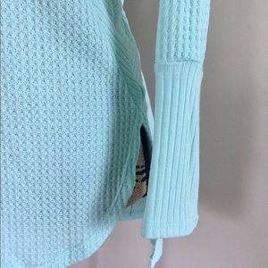 Season transition staple! Mint green waffle knit top. Crew neck, full length sleeves, side split hem. Super soft and comfy! 63% polyester 34% rayon 3% spandex. S-bust 20", front length 25", back 28"