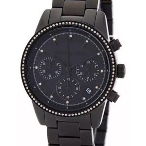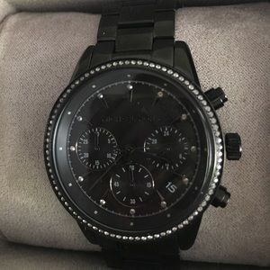 New in box with tags and booklet!! Michael Kors Ritz black stainless steel link watch. Chronograph on round dial with crystals at bezel as shown. Crystals at indices. Style #MK6538. Case: 36mm. Open to offers; NO trades!