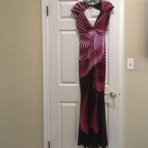 Turn heads wearing this Roberto Cavalli Red Gown Long Dress. Perfect for a chic evening occasion, this is a gorgeous long dress for a perfect wedding party or ball. Features pink and red tones print, this gorgeous dress define your silhouette in a smoothy way. This dress is pre-owned, Italian. Style with black high heels and your evening purse! Stand out from the crowd with this Dress. 88% Pollammide/ 12% Elastane. Made in Italy. Dress dimensions: Armpit to Armpit 21", Length 65". Length 65 in
