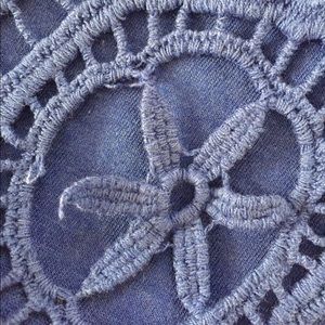 Gorgeous blue Anthropologie Ella Moss lace skirt with attached blue slip underneath. Slightly high-low hem, and slip is shorter to expose legs through lace at bottom. Elastic waist measures 15" flat and stretches several inches as needed. Size Large. Lace needs a few small stitches in 2 places. See photo.