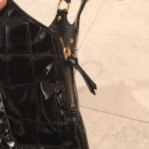 This bag is a YSL croc embossed patent leather "tribute" black tote bag. 14"Lx 1"Wpn