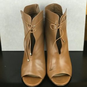 @sooji328 hi, Ankle-high buffed leather boots in ‘canyon’ tan. Round peep toe. Vent at vamp and sides with self-tie drawstring fastening. Leather sole in beige. Tonal stitching. Approx. 4″ stiletto heel. Leather. Made in Italy.