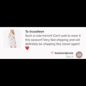 NWT Boutique Item. The Molly Trench Coat Jacket is perfect to pair with your Off the Shoulder tops! It features an off the shoulder silhouette, fold over detail, double breasted front, self belt (may be tied, buckled or removed), full lining, and long sleeves.