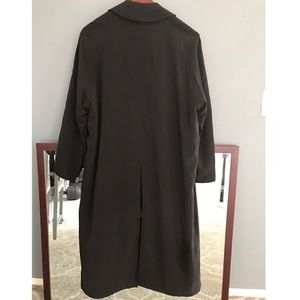 Men Chaps Ralph Lauren Seasonal Coat. Exterior shell is made of microfiber 100% polyester. Lining is 100% polyester. It also has removable liner inside made of 80% wool 20% viscose. MADE OF HIGHEST QUALITY RAIN & STAIN REPELLENT. solid black pattern. Has exterior & interior pockets. Button up coat. The back has a faux center vent that can be closed with a button that can be concealed. Great for winter. Top to bottom is 58" long. Fits great over suits & clothes without looking bulky.
