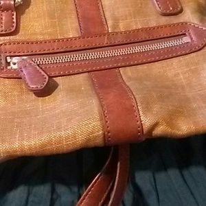 Relativity Gold Fabric/Brown Handles and Shoulder Strap Bag. EUC.