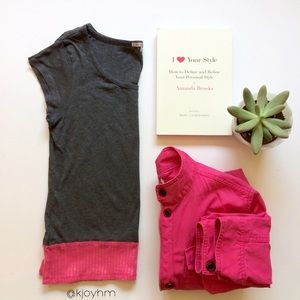 This soft gray scoopneck top has a hot pink sequined band around the bottom for a fun update on the traditional T. Great with shorts, jeans, or a skirt, it looks cute under a cardigan or jacket so the pop of pink shoes. In excellent, like-new condition. Worn 1-2 times. 18.25" across bust, 24" long.