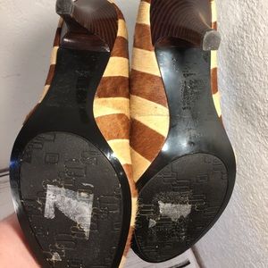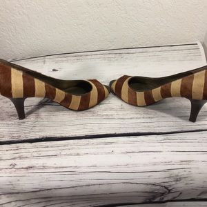 Great Condition! Beautiful Bronze & Gold Stripe Cow Hair Peep Toe Pumps. Hardly any wear. Chic shoes for work or play. Part leather/part man made. 3 1/4 inch heel. Non Smoking Home. Soles show no wear. Sale price Firm.