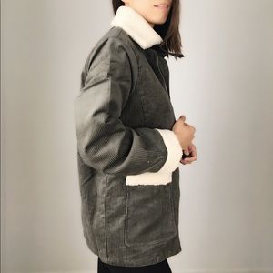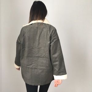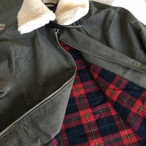 Fall must have piece. Faux shearling collar & sleeves end. Dirty Olive corduroy jacket with Moto buckle top for a hint of rebel note. Plaid pattern lining.I'm wearing size SM for cover shot. Bust 36" , length 28", width 40".