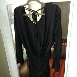 V NECK OPEN BACK DRAPED BODYCON DRESS. MATERIAL IS VERY STRETCHY. FABRIC IS POLYESTER.