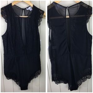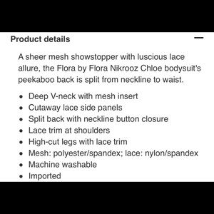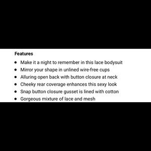 Brand new with tags. Size medium. Please see the last two photos for additional features/details. Sexy one piece! Flora Nikrooz khloe black lace mesh bodysuit.