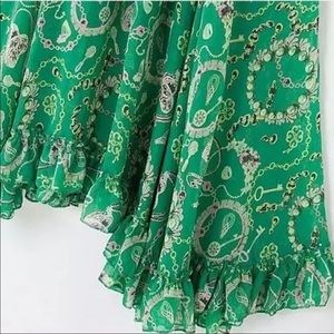 New! Emerald Gypsy Dress • Stunning chiffon print, plunging neckline, empire waist, ties in back, 3/4 Sleeves, Partially lined. Ruffled hem.