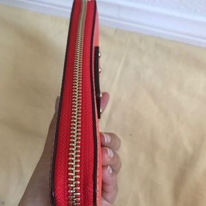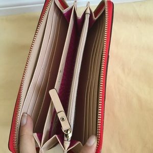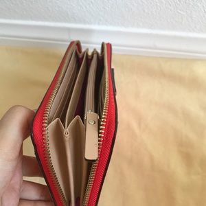 12 credit card slots, 3 billfolds, and zipper change pocket; exterior slide pocket