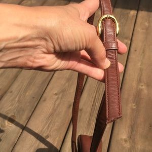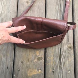 Vintage Talbots leather bag. The leather has aged beautifully. Snap closure, inside zip pocket, back slit pocket. Approximate measurements: 8.5" long x 7" tall x 2" deep with a 19.5" strap drop. Shoulder bag or cross body. Gold tone hardware in excellent condition. Please see all photos.