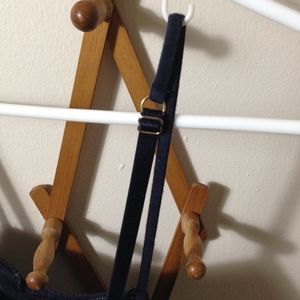 Women's tank top size small in navy blue. Style: Bra top. Built in bra. Adjustable straps w/ gold tone hardware. 4 white buttons that are just for show. Empire waist. Lace lining at top and bottom, but the lace is 'curling' a bit from wear. Other than that, good condition.