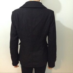 Cute Peacoat featurest front button closure, two up pockets, two lower pockets show in picture 3. Peacoat has useable zips at wrist, removable hood fold down collar with inside lining. Peacoat can be worn dressed up, or casual with jeans, coat hits at waist, style it your way. Size Medium is a 8-10,size Large is a 10-12, size XL Is a size 12-14. Measurements from top back collar to bottom is 26 inches long. Measurements on the sleeves are 25 1/2 inches in length.
