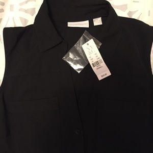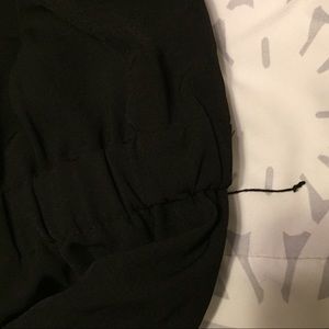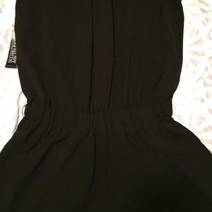 Black romper with a tied belt and collar. Hemline is cuffed. 4 pockets. 92% Polyester, 8% spandex. Size is XS but it fits like a small or medium (size 6-8). New York & Co runs on the bigger side. Side has one broken thread for belt. It's not noticeable. (See picture) NWT.
