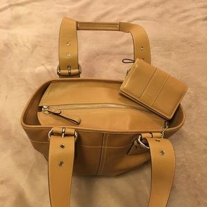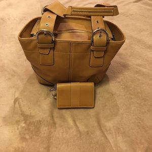 Authentic Coach tan 100% leather satchel handbag. Matching coach wallet with attached key ring silver hardware zipper top. Coach monogram lined beige interior. Beautiful white stitching, Excellent condition. Purchase only. No trades.