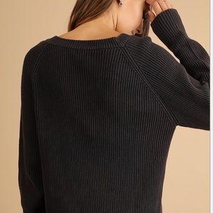 Beautiful mineral washed V-neck sweater with drawstring detail. Color is Charcoal.
