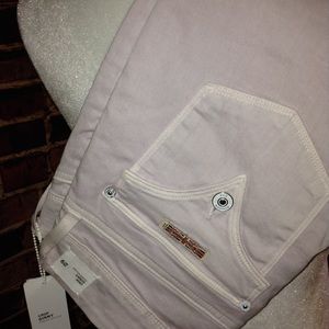 I hate to part with these beauties but I’m favoring more of a high rise Jean these days. Since I’ve never actually worn them, I decided to offer them up for sale. The color is between a lilac and very light gray. Last pic is most accurate color. Super cute!