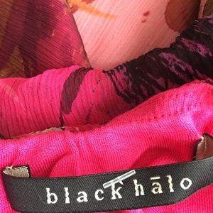 Sample item from Black Halo. The elegance of a necktie blouse meets the ease of a halter top in this one-of-a-kind piece. Silk chiffon in a colorful abstract floral print, lined in a hot pink jersey. Accent buttons trail down front of the fitted waist, with hidden buttons down front of blouson-style top. Sample tag attached; no size/fabric tags however. Size S.