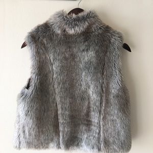 This is a faux fur vest with a mock neck and optional hook and eye closure.