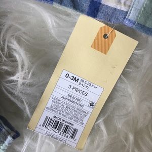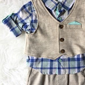 Crazy cute. Just look at that faux pocket square! No joke, this is insanely cute. The vest and pants are lightweight Cotton blend so it's much more comfy for a newborn than an actual suit would be. Super sweet tan linen-look with blue plaid shirt that can be rolled up for a stylish look. Great choice for baby's first party!! Is size 0-3 months but looks slightly larger than that to me.