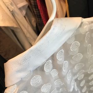This adorable top is sheer with patched polka dots😍 the pocket and collar are leather material! Worn once to a festival but got it very dirty there 😅 the collar has some gray marks! I will post more pictures of that very soon but still a beautiful piece 🔥