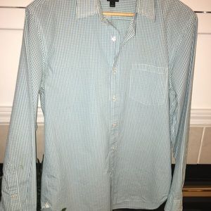 Good used condition. Small stain on right sleeve - looks way more obvious in pic - can hardly see actually. Clean , smoke free home !!Colors are green and blue stripes in white shirt .